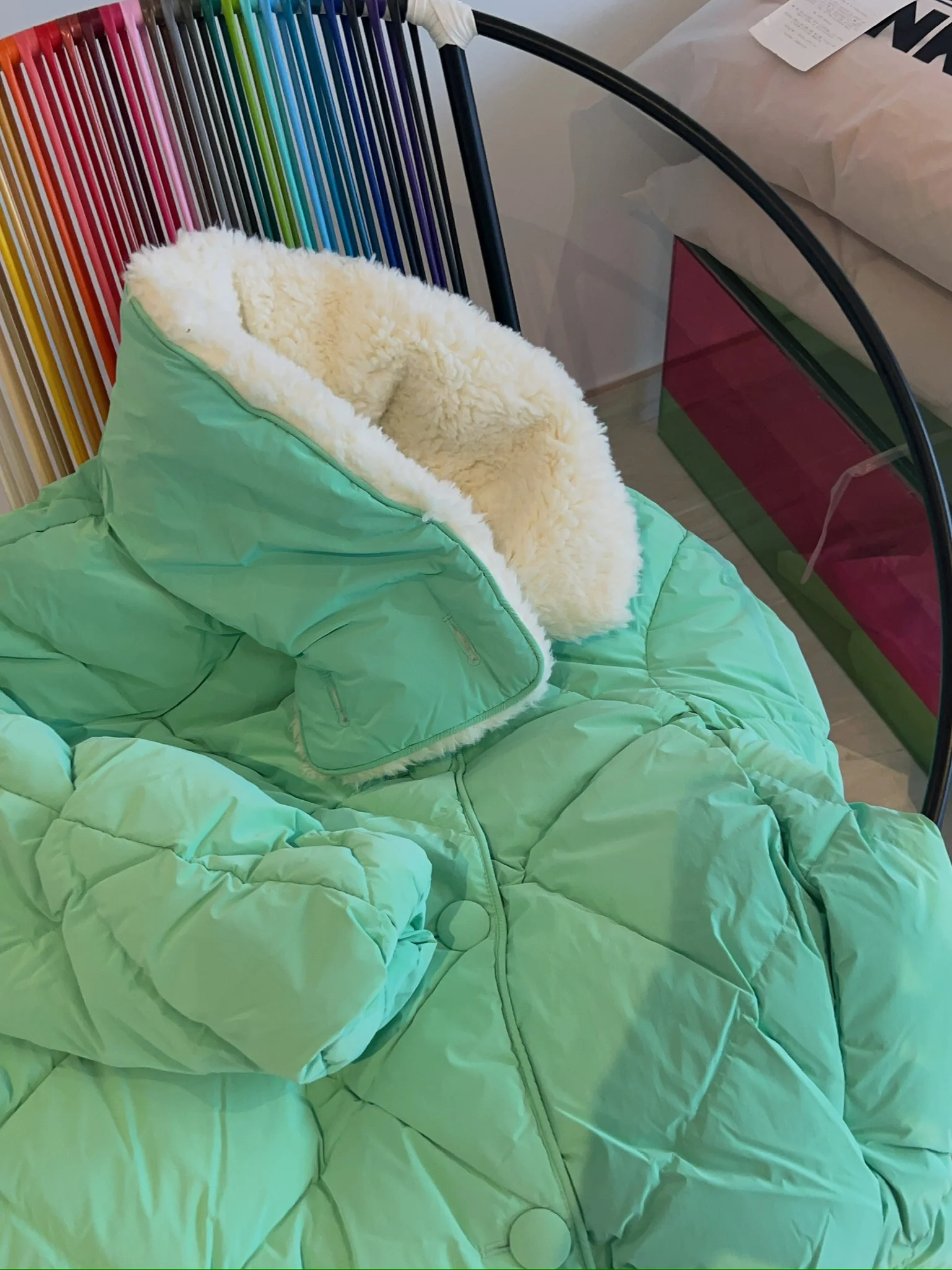 The Shearling Queen Jacket's silhouette refers to the Arctic nations' traditional clothes. The elements of the shearling coat can be seen in the stand-up collar and the button closure, which hides the zipper to trap in ever more heat.
