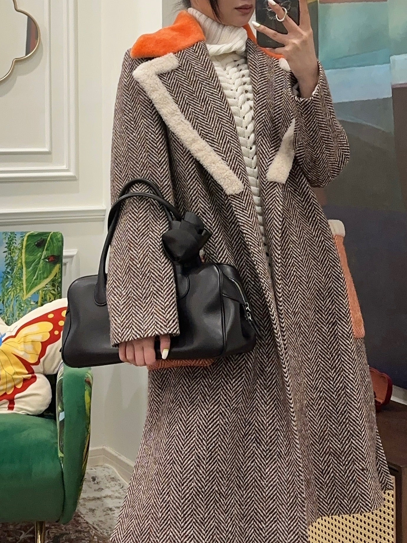 Harringbone Wool Coat With Belt And Shearling Details