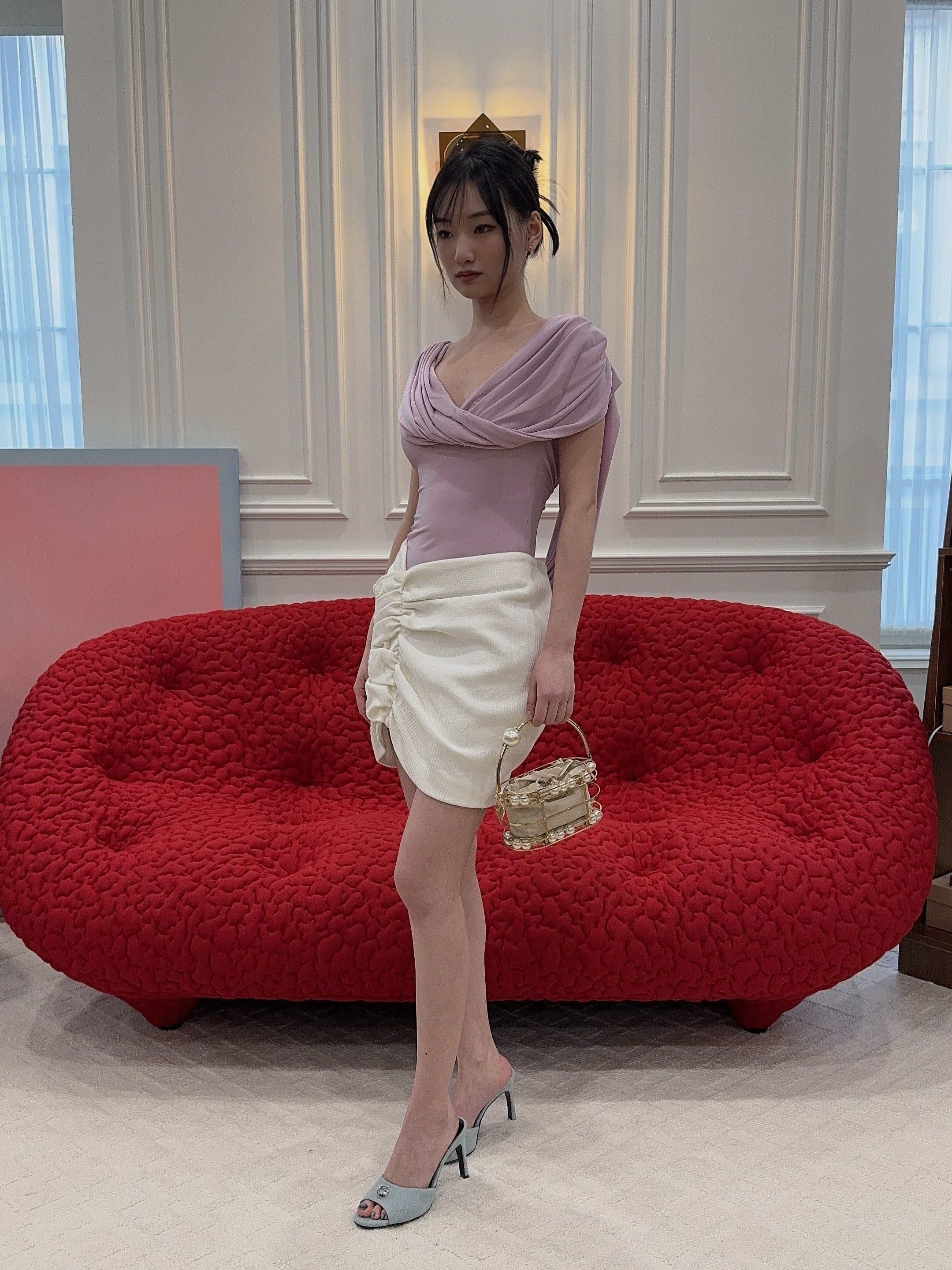 ruched asymmetric skirt from The Mannei featuring milk white, cotton blend, chenille texture, asymmetric design, ruched detailing, concealed rear fastening and full lining.